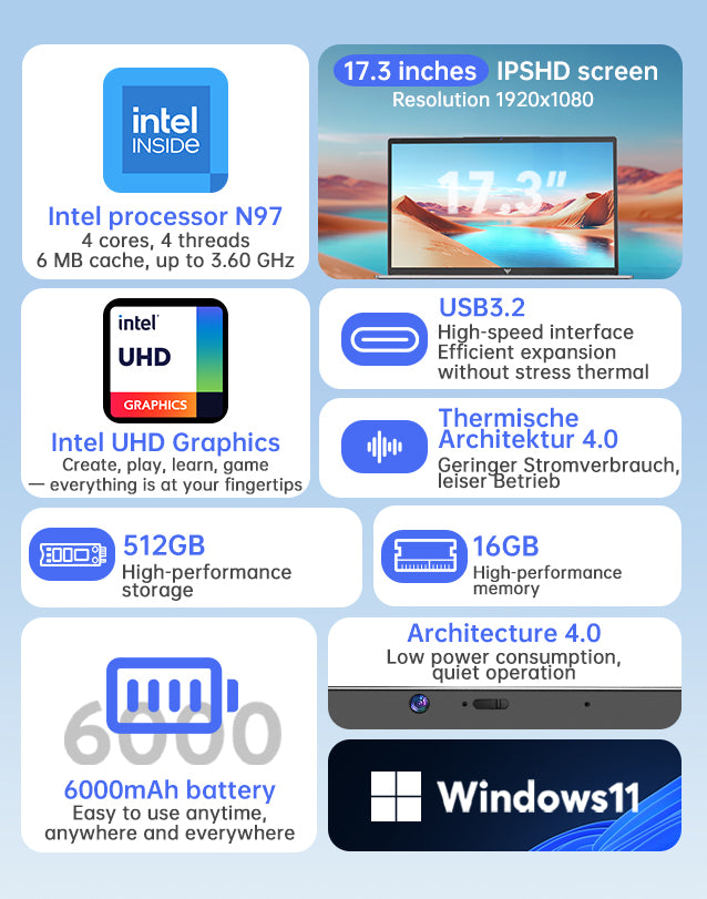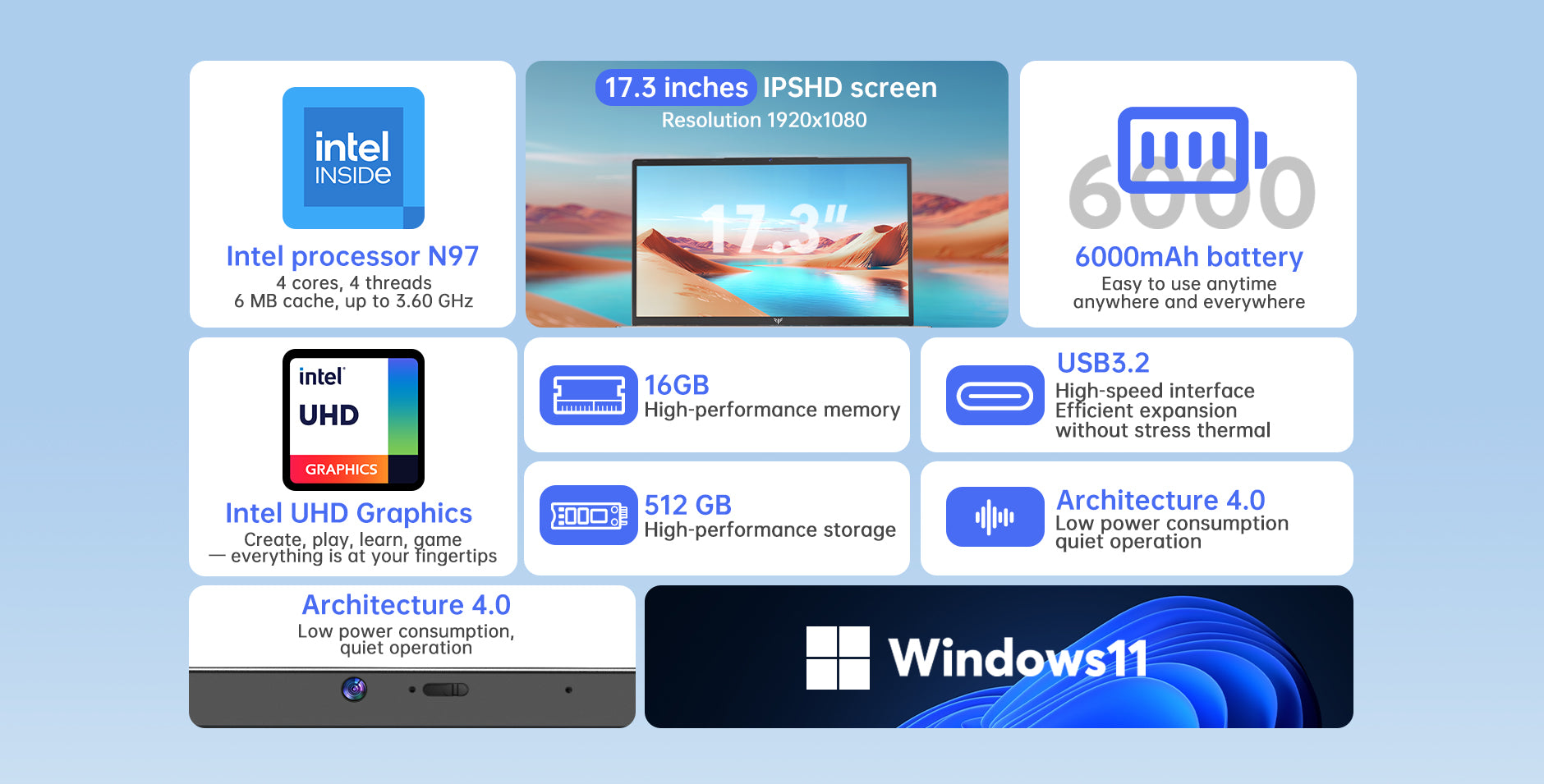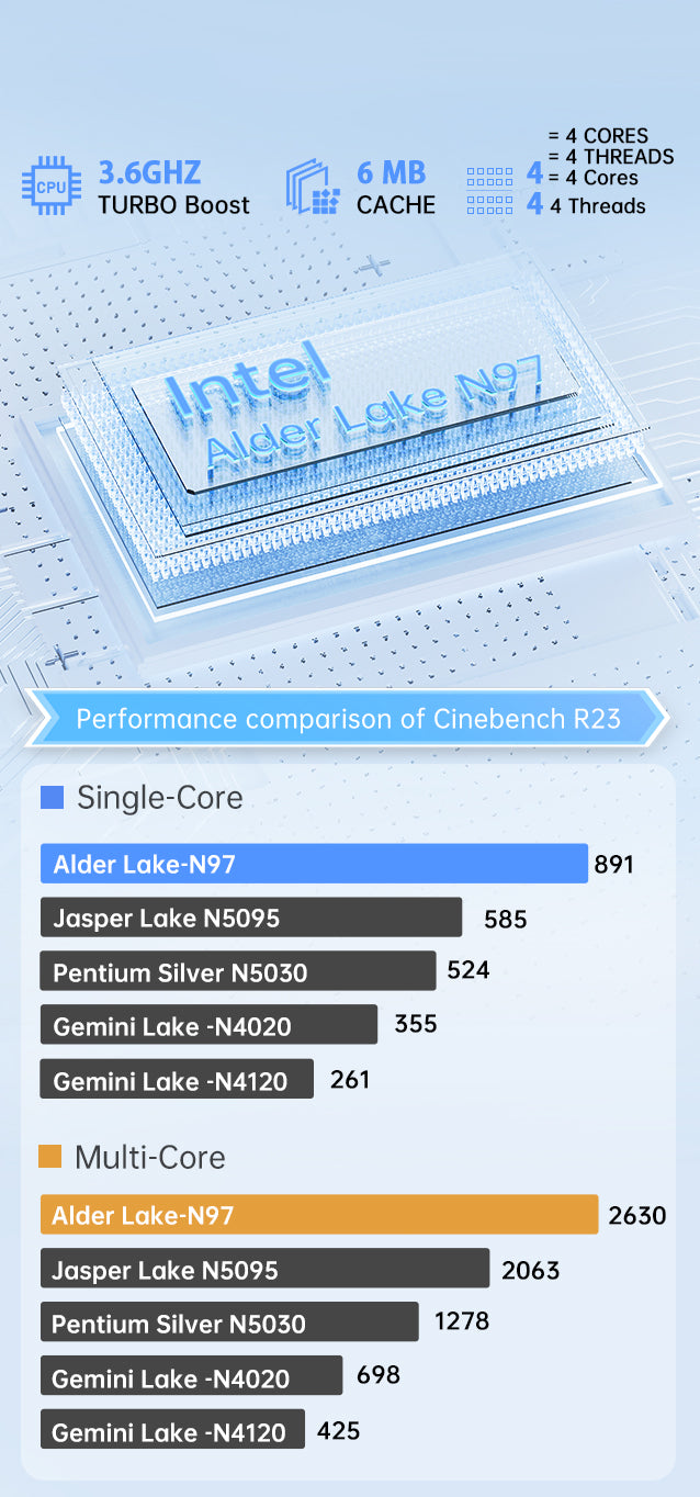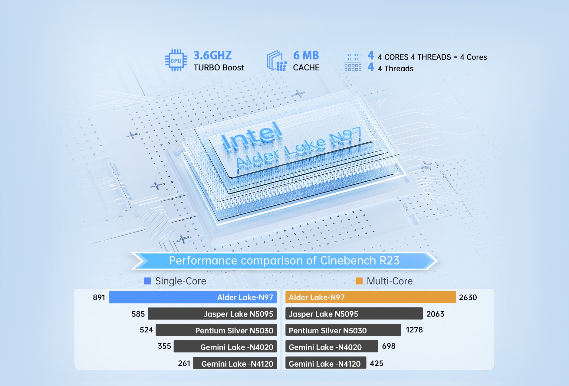 | Processor | Intel Twin Lake N150 Processor, 4 Cores/4 Threads, 6 MB Smart Cache, base frequency 0.8GHz, maximum acceleration clock frequency (Turbo) 3.6GHz |
