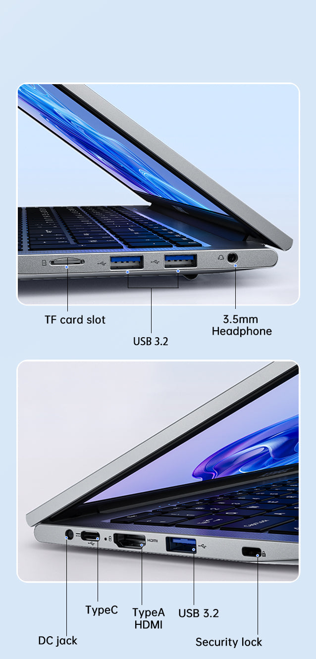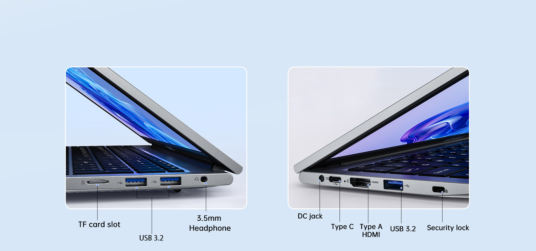| Ports & Buttons | USB 3.2 *3 3.5mm standard headphone jack *1 HDMI 1.4 *1 DC IN *1 Type-C(Data) *1 TF card slot *1 Keyhole*1 |