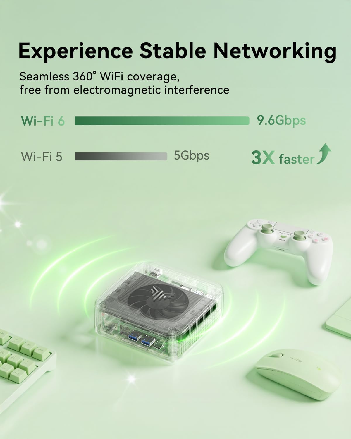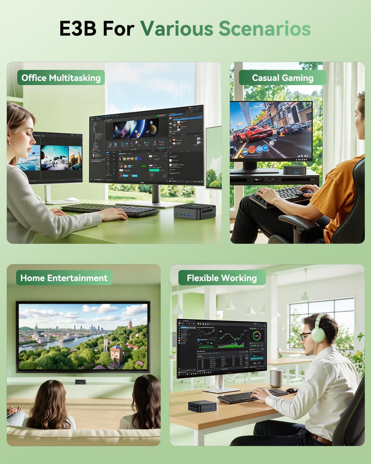 The KAMRUI E3B Mini PC is powered by the AMD Ryzen™ 7 7735HS processor, featuring 8 cores and 16 threads with a max boost clock of up to 4.75 GHz. It comes with integrated Radeon™ Graphics, delivering strong performance for multitasking, content creation, and light gaming. This compact computer is ideal for office productivity, photo and video editing, multi-screen workflows, and smooth 4K media streaming.