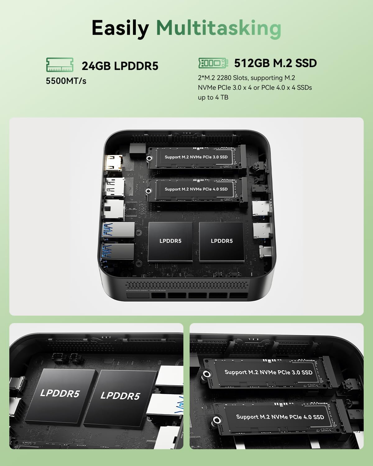 | Storage | 512GB M.2 2280 NVMe PCIe3.0×4 SSD (M.2 2280 Slot*2, supports M.2 NVMe PCIe3.0/4.0 SSD, SATA SSD not supported, up to 4TB) |