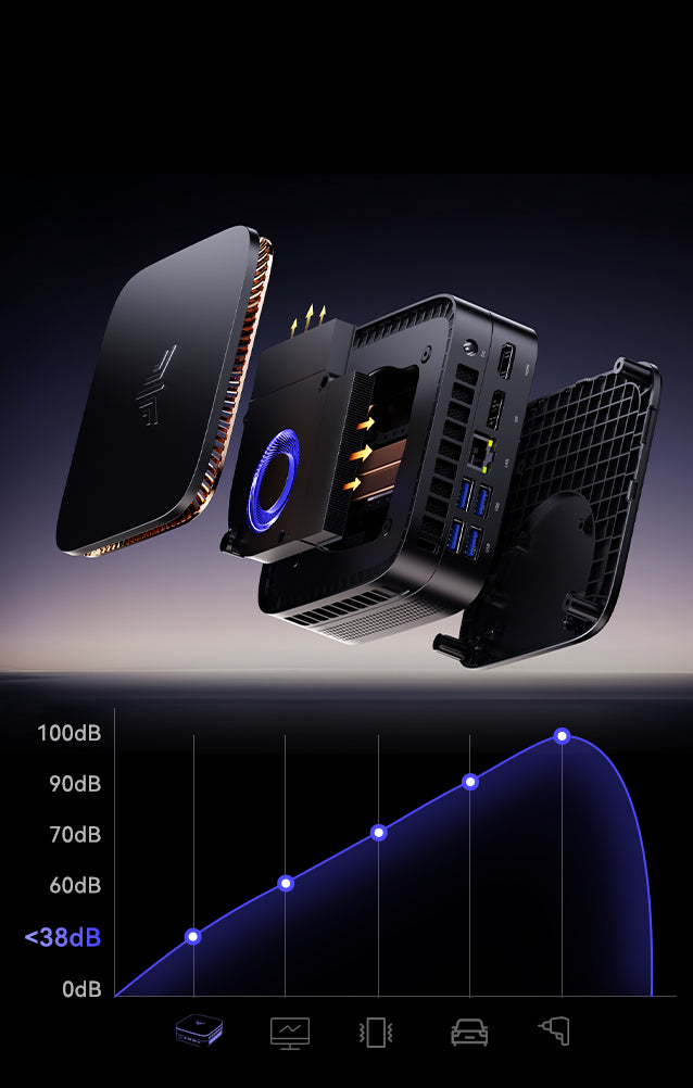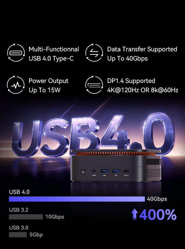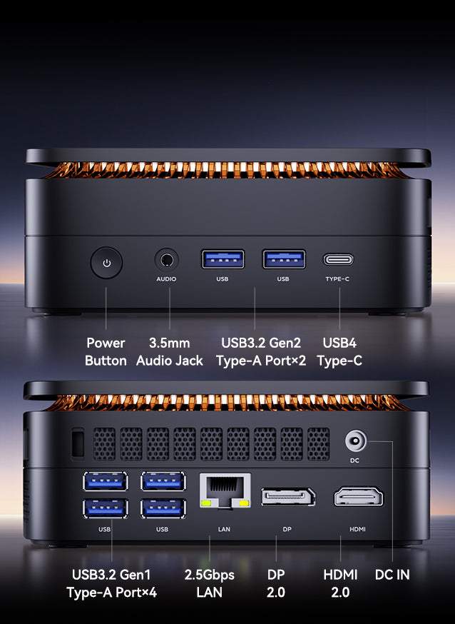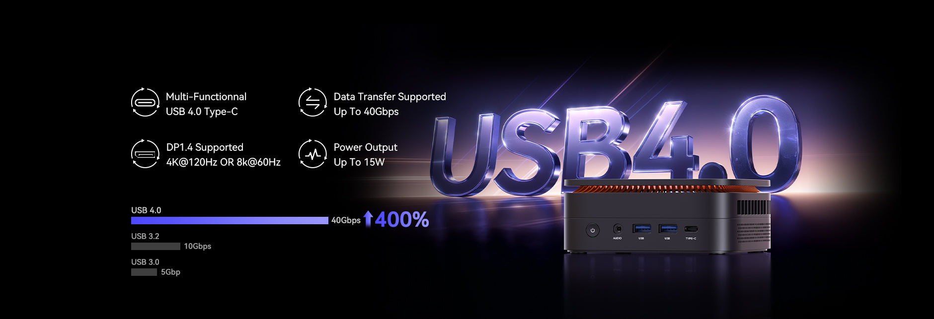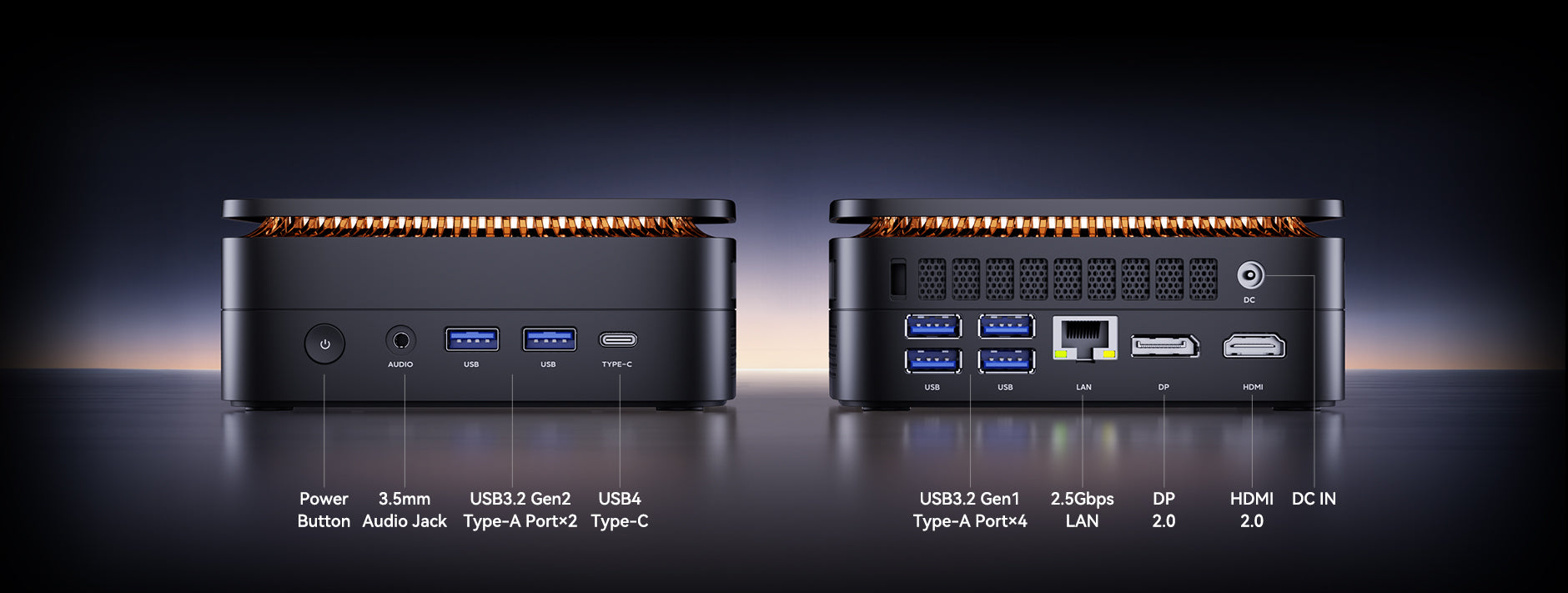 | Ports & Buttons | 2.5Gbps (10M/100M/1000Mbps adaptive) LAN Port *1 USB3.2 Gen2 Type-A Port *2 (front port) USB3.2 Gen1 Type-A Port*4 (behind port) USB4 Type-C *1 (Support DP1.4, 8K@60Hz/4K@120Hz, maximum 40Gbps data transfer, PD 15W output) DC IN *1 HDMI 2.0 *1 DP2.0 *1 3.5mm Audio Jack *1 Power Button *1 |