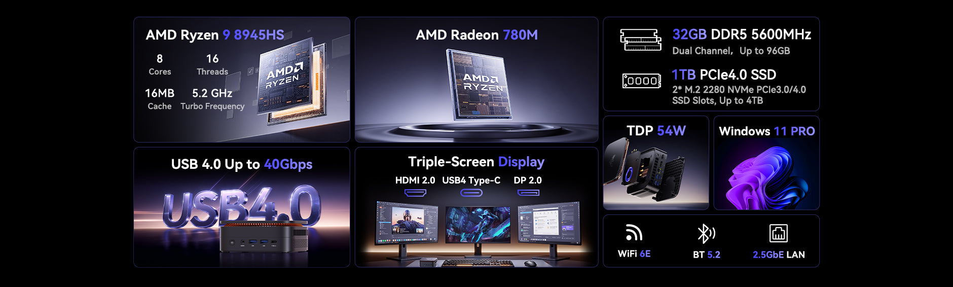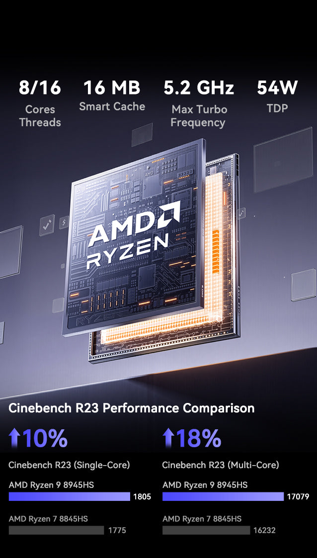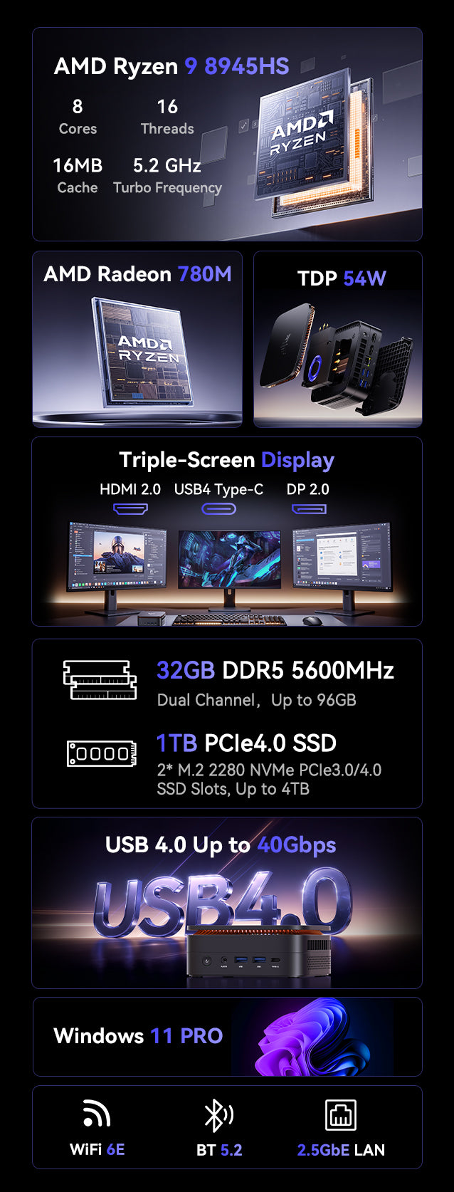The NiPoGi G1 Mini PC is powered by the AMD Ryzen 9 8945HS processor, featuring 8 cores and 16 threads with a max boost clock of up to 5.2GHz. It comes equipped with integrated AMD Radeon™ 780M graphics, offering excellent performance for graphics-intensive tasks. This compact computer is ideal for video and photo editing, office productivity, up to 8K video playback, casual gaming, and home theater use.
