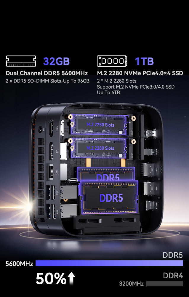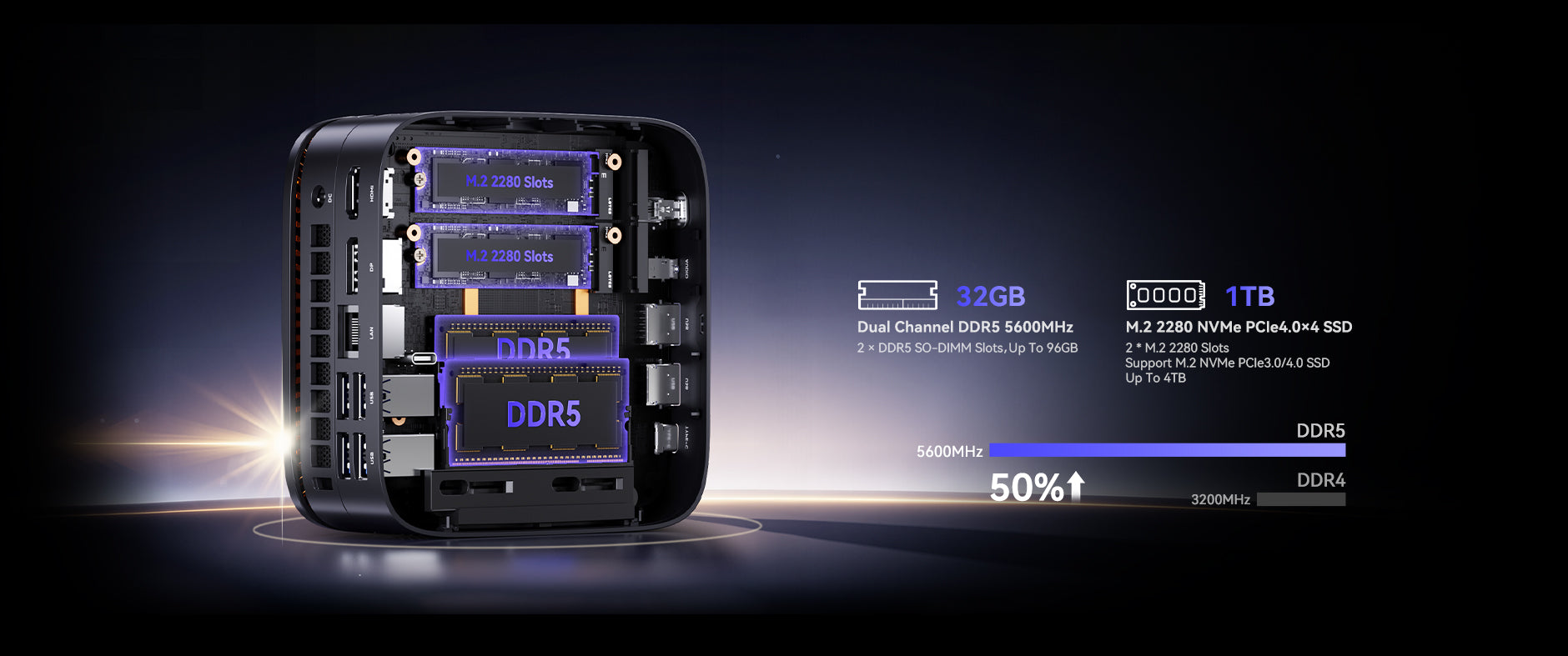 | Memory | 32GB DDR5 5600MHz (SO-DIMM Slot*2, up to 96GB, support maximum frequency is 5600MHz) |