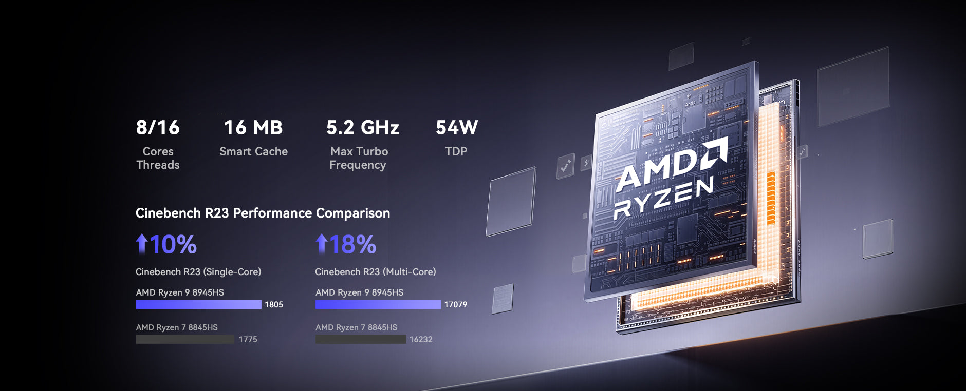 | Processor | AMD Ryzen™ 9 8945HS Processor, 8 Cores/16 Threads, 16 MB L3 cache, base frequency 4GHz, maximum acceleration clock frequency (Turbo) 5.2GHz |