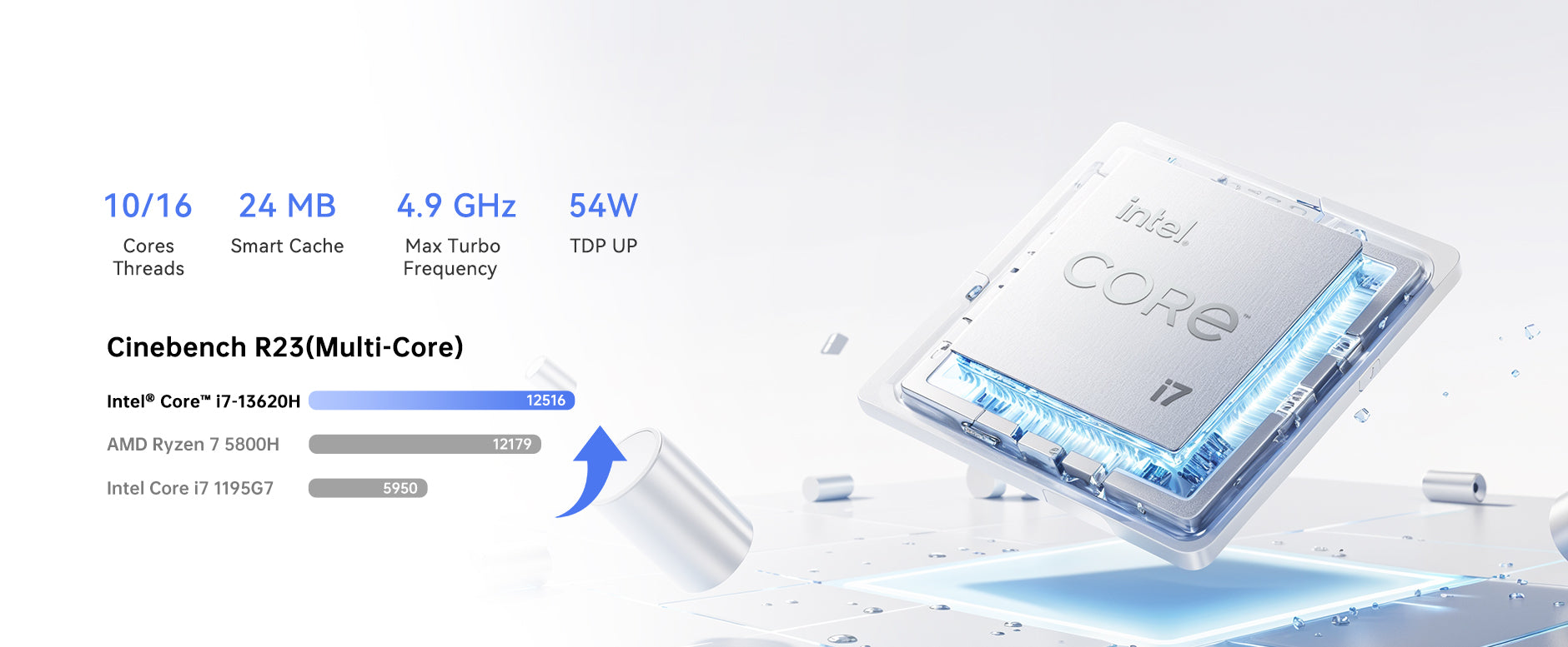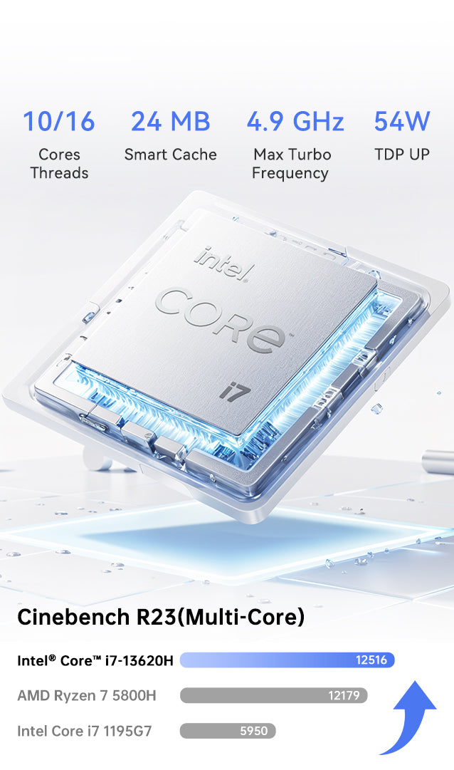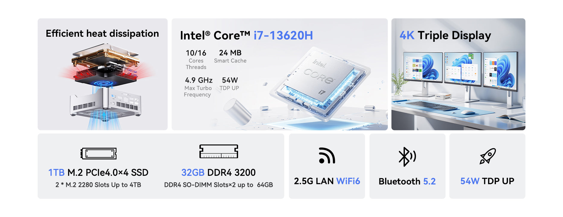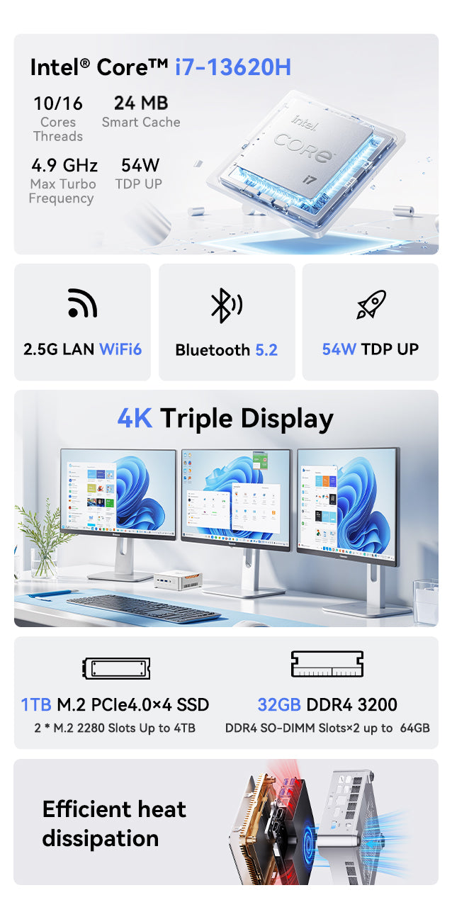 The NiPoGi H2 Mini PC is powered by the Intel® Core™ i7-13620H processor, featuring 10 cores and 16 threads with a max boost clock of up to 4.3GHz. It comes equipped with integrated Intel® UHD Graphics, offering excellent performance for graphics-intensive tasks. This compact computer is ideal for video and photo editing, office productivity, 4K video playback, casual gaming, and home theater use.
