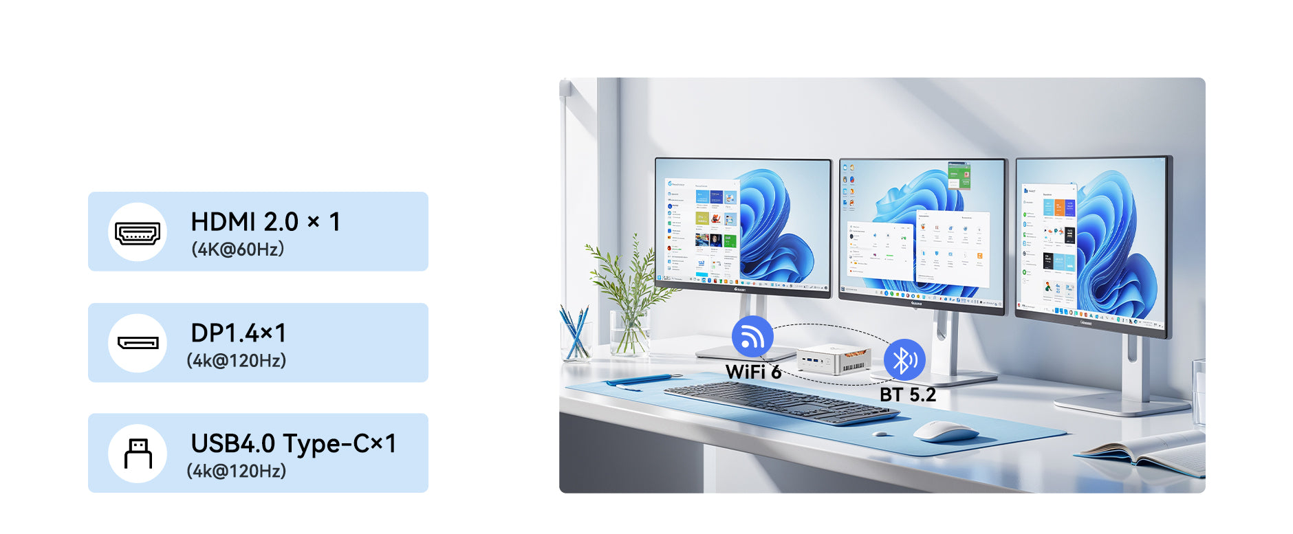 | Video Output | HDMI 2.0*1 (4K@60Hz) DP1.4*1 (4K@120Hz) USB4 Type-C*1 (4K@120Hz) |