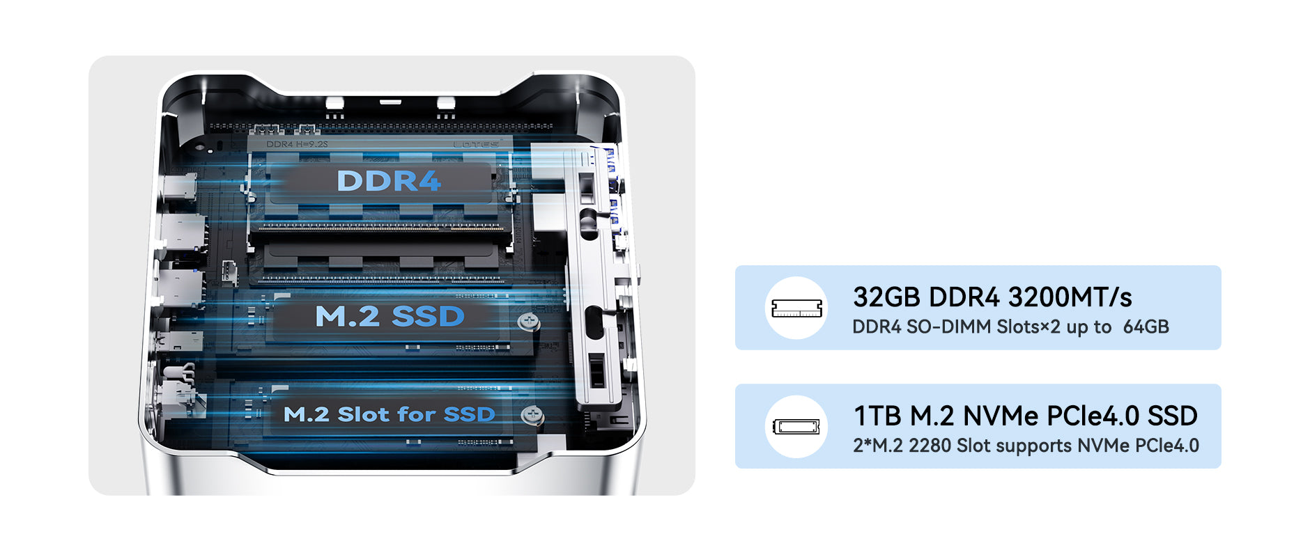 | Storage | 1TB M.2 2280 NVMe PCIe4.0×4 SSD (2*M.2 2280 Slot, M.2 2280 SATA&NVMe Slot×1; M.2 2280 NVMe Slot×1, single hard disk interface supports up to 2TB) |