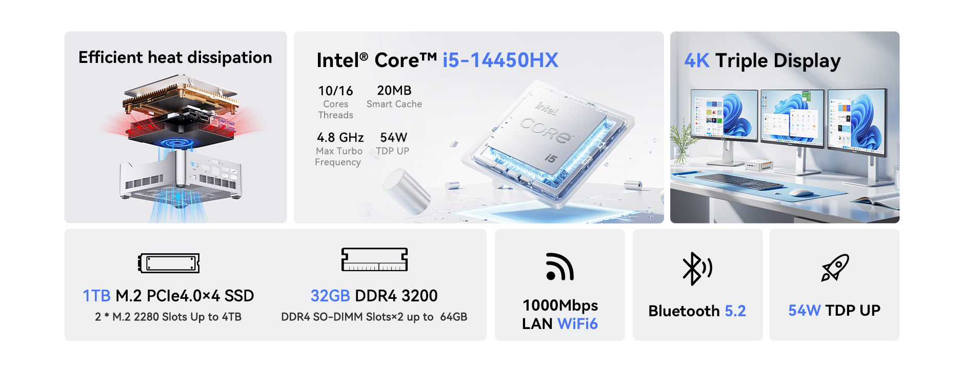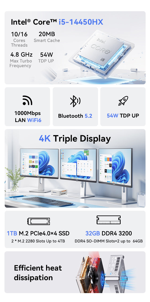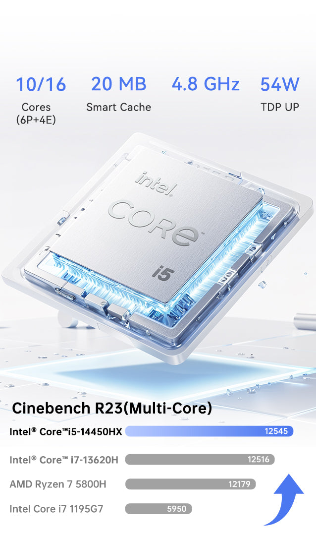 The NiPoGi H2 Mini PC is powered by the Intel® Core™ i5-14450HX processor, featuring 10 cores and 16 threads with a max boost clock of up to 4.8GHz. It comes equipped with integrated Intel® UHD Graphics for 14th Gen Intel® Processors, offering excellent performance for graphics-intensive tasks. This compact computer is ideal for video and photo editing, office productivity, 4K video playback, casual gaming, and home theater use.