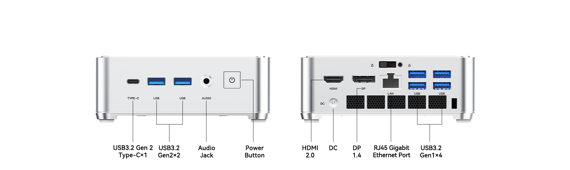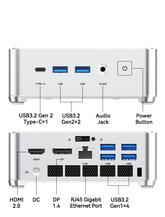 | Ports & Buttons | 10M/100M/1000Mbps adaptive RJ45 Gigabit Ethernet Port ×1 USB3.2 Gen2 Type-A Port *2 (front port) USB3.2 Gen1 Type-A Port*4 (behind port) USB3.2 Gen 2 Type-C *1 (Support DP1.4, 4K@60Hz, maximum 10Gbps data transfer, PD 15W output) DC IN *1 HDMI 2.0 *1 DP1.4 *1 3.5mm Audio Jack *1 Power Button *1 |