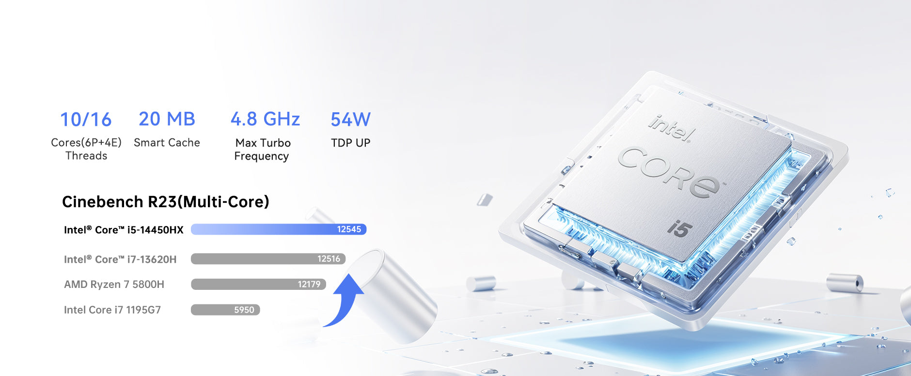 | Processor | Intel® Core™ i5-14450HX, 10 Cores(6P+4E)/16 Threads, 20MB Intel® Smart Cache, base frequency 2.4GHz, maximum acceleration clock frequency (Turbo) 4.8GHz |