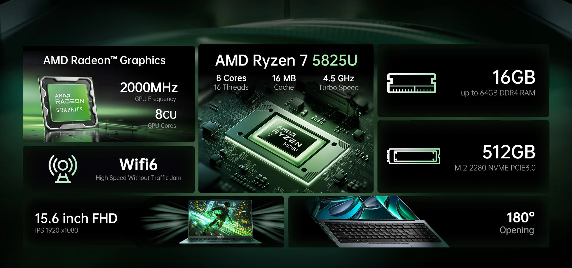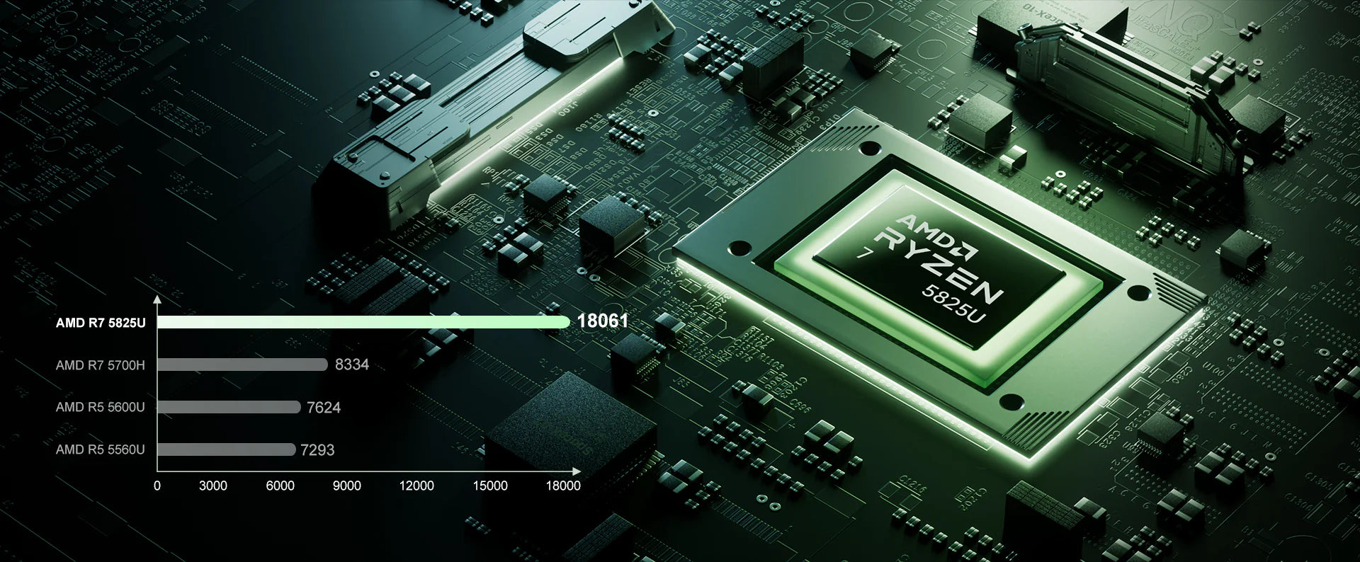 | Processor | AMD Ryzen™ 5825U Processor, 8 Cores/16 Threads, 16 MB Smart Cache, base frequency 2.0GHz, maximum acceleration clock frequency (Turbo) 4.5GHz |