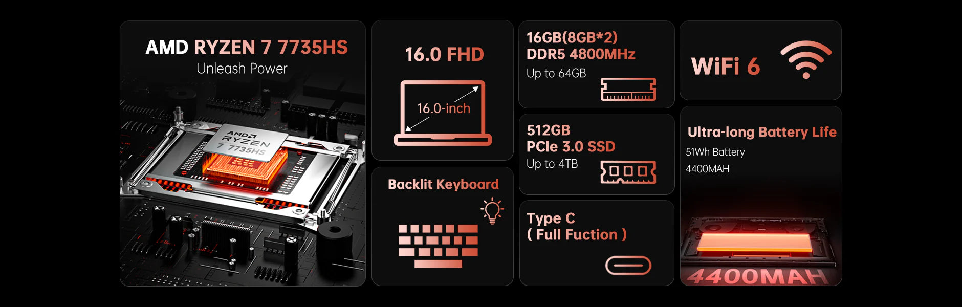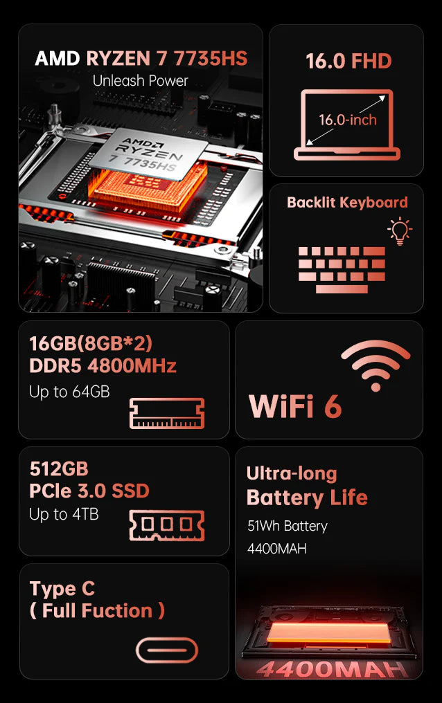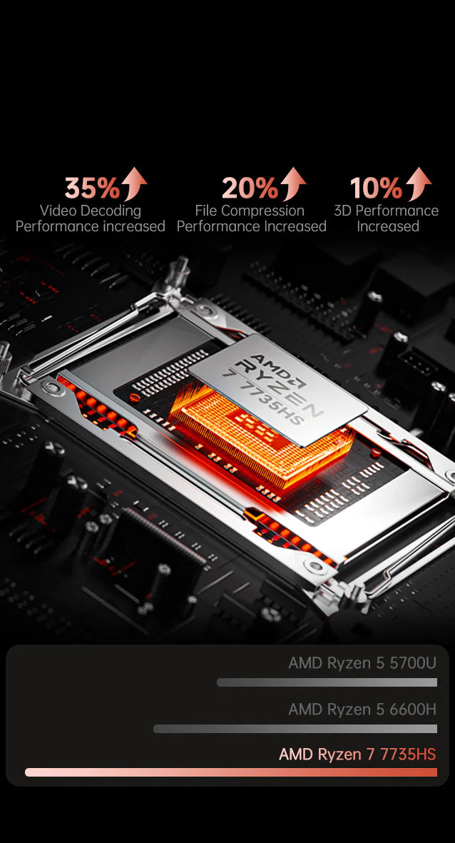 | Processor | AMD Ryzen™ 7 7735HS Processor, 8 Cores/16 Threads, 16 MB Smart Cache, base frequency 3.2GHz, maximum acceleration clock frequency (Turbo) 4.75GHz |
